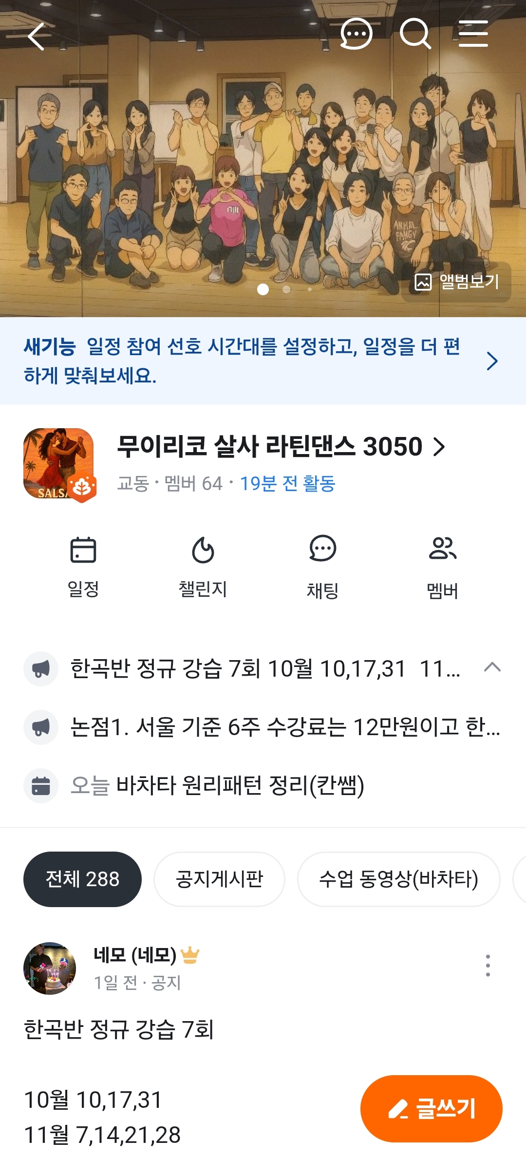 매주 모여서 살사, 바차타는 즐기고 있답니다.